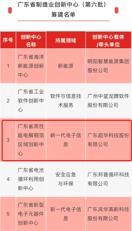 近日,廣東省工業(yè)和信息化廳公布了第六批廣東省制造業(yè)創(chuàng)新中心籌建名單,由廣東超華科技股份有限公司牽頭申報(bào)的廣東省高性能電解銅箔區(qū)域創(chuàng)新中心獲批建設(shè),為廣東制造業(yè)發(fā)展提供創(chuàng)新示范點(diǎn)。據(jù)了解,廣東省制造業(yè)創(chuàng)新中心是面向全省制造業(yè)創(chuàng)新發(fā)展需求,以重點(diǎn)領(lǐng)域前沿技術(shù)和共性關(guān)鍵技術(shù)的研發(fā)供給、轉(zhuǎn)移擴(kuò)散和首次商業(yè)化為重點(diǎn),由企業(yè)、科研院所、高校等各類創(chuàng)新主體自愿組合、自主結(jié)合,以企業(yè)為主體,以獨(dú)立法人形式創(chuàng)建的省級(jí)創(chuàng)新平臺(tái),解決關(guān)鍵核心技術(shù)受制于人、產(chǎn)業(yè)共性技術(shù)供給不足、創(chuàng)新成果產(chǎn)業(yè)化不暢的問(wèn)題,滿足廣東省新一代電子信息、新材料、智能制造、高端裝備制造、新能源汽車、生物醫(yī)藥等戰(zhàn)略性新興產(chǎn)業(yè)發(fā)展需求,助力制造業(yè)轉(zhuǎn)型升級(jí),提高國(guó)家制造業(yè)創(chuàng)新能力。此次超華科技牽頭申報(bào)的廣東省高性能電解銅箔區(qū)域創(chuàng)新中心獲批建設(shè),也體現(xiàn)了超華科技深厚的技術(shù)底蘊(yùn)和實(shí)力。